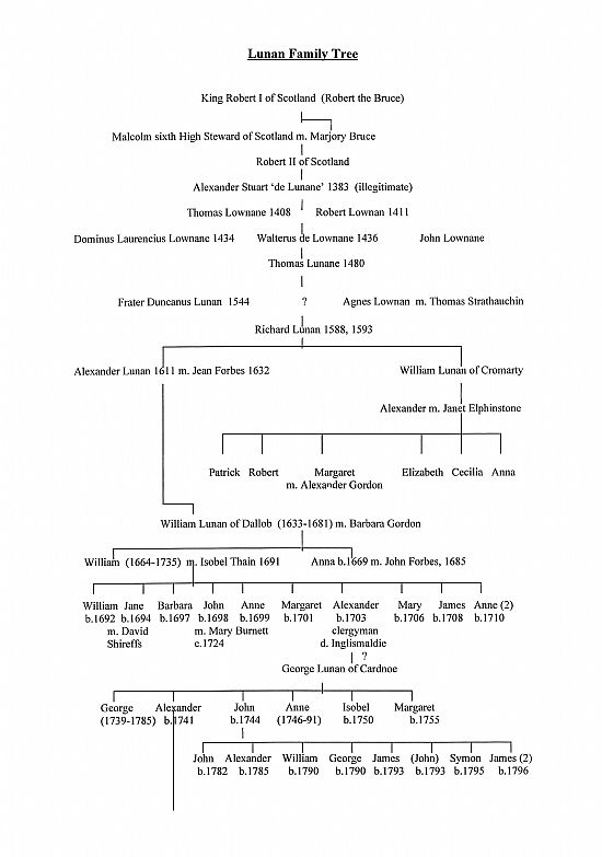 His son Alexander Lunan went to King’s College, Aberdeen in 1611, graduated M.A. with Honours in 1615, became Humanist in the University in 1618 and Regent in 1626, when he was parson of Monymusk, later minister of Kintore.   Alexander’s brother William graduated M.A. from King’s College in 1626, becoming servitor to Sir Thomas Urquhart of Cromarty by November 1638.   He seems to have been a colourful character, because in February 1645 the Presbytery of Turiff was appointed by the General Assembly ‘to proceed with his excommunication’.   Nevertheless he was admitted to the Presbytery of Garioch by October 1666, and was still minister there is October 1671.7  Alexander’s son William Lunan of Dallob  (1633-1681)  was also a Notary Public and minister of Daviot 1663-77.   He had two children, William and Anna.   This third William was born at Dallob in 1664 and married Isobel Thain, by whom he had ten children.5,8   His cousin Alexander, son of William of Cromarty, graduated M.A. from King’s College in July 1664.9