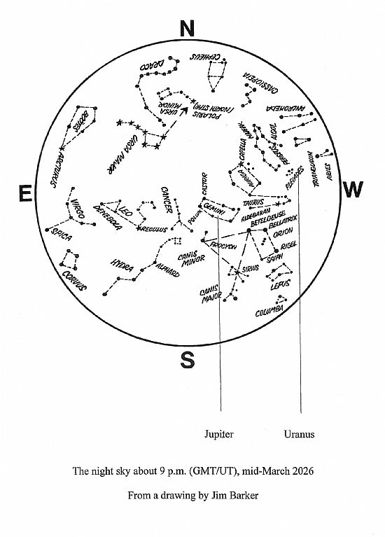 Venus is now visible low in the west, very bright and setting around 7.30 p.m. by the end of March, near the Moon on the 20th. To avoid confusing it with a UFO, or with the Artemis 2 mission which might have been near the Moon at the time, ask yourself whether you can see two bright objects or just one, which is Venus. (Artemis 2 wouldn't be visible even if it was close to the Moon at the time, but as of 23rd February, the possible launch dates in March were the 6th to the 9th, in which cases the 10-day mission would bring it back by the 20th, or March 11th with return on the 21st. But rolling back the booster on 25th February, to address a helium blockage in the Interim Upper Stage, means that an April launch is more likely.)