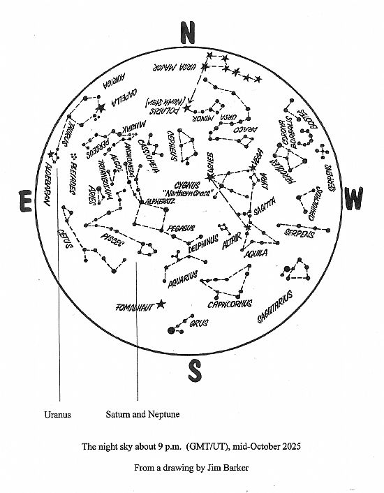 Saturn in Pisces is near the Moon on the night of 5th-6th October, setting about 5 a.m.. Nigel Henbest's Stargazing 2025 says it 'passes over' Saturn, but I think that means 'above', because there's no mention of an occultation in the Collins 2025 Guide to the Night Sky or in the October Astronomy Now, which says they will be 4 degrees apart. Titan, the second largest moon in the Solar System, transits the planet on the night of October 21st/22nd, and is occulted by it on the evening of the 29th. For more details see this month's Astronomy Now.